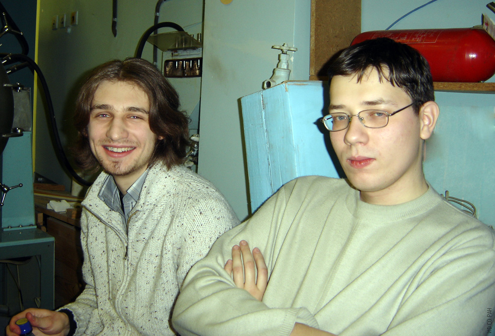 Молодые сотрудники лаборатории кристаллофизики Института физики им. Л.В. Киренского Сибирского отделения Российской академии наук (ИФ СО РАН) Павловский М.С (слева) и Жандун В.С., фото 2006 года. Красноярск.