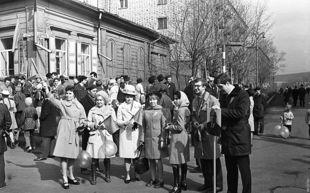 На первомайской демонстрации 1974 года. На переднем плане, сотрудники Института физики им. Л.В. Киренского Сибирского отделения Академии наук СССР (ИФ СО АН СССР), слева направо: Хренова С.Н., Игнатенко Т.В., Терскова М.И., Сидько С.Ф., Щур Л.А., Ваганов Е.А., Лепешев А.А. Красноярск.