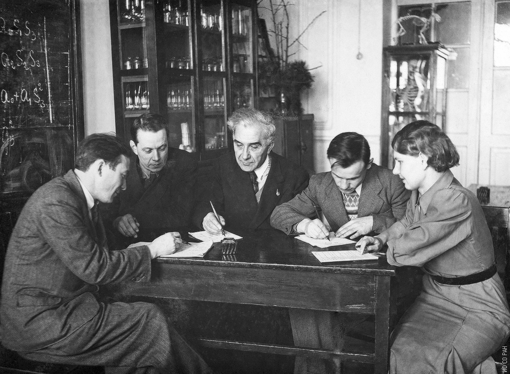 В конце ноября 1941 года Л.В. Киренский организовал коллоквиум по ферромагнетизму, ставший впоследствии общегородским физическим семинаром, работа которого продолжалась более 30 лет. На фото участники первого семинара по магнетизму (слева направо): Киренский Л.В., Сарапкин П.С., ?, Ивлев В.Ф., Королева Н.С., фото 1941 года.