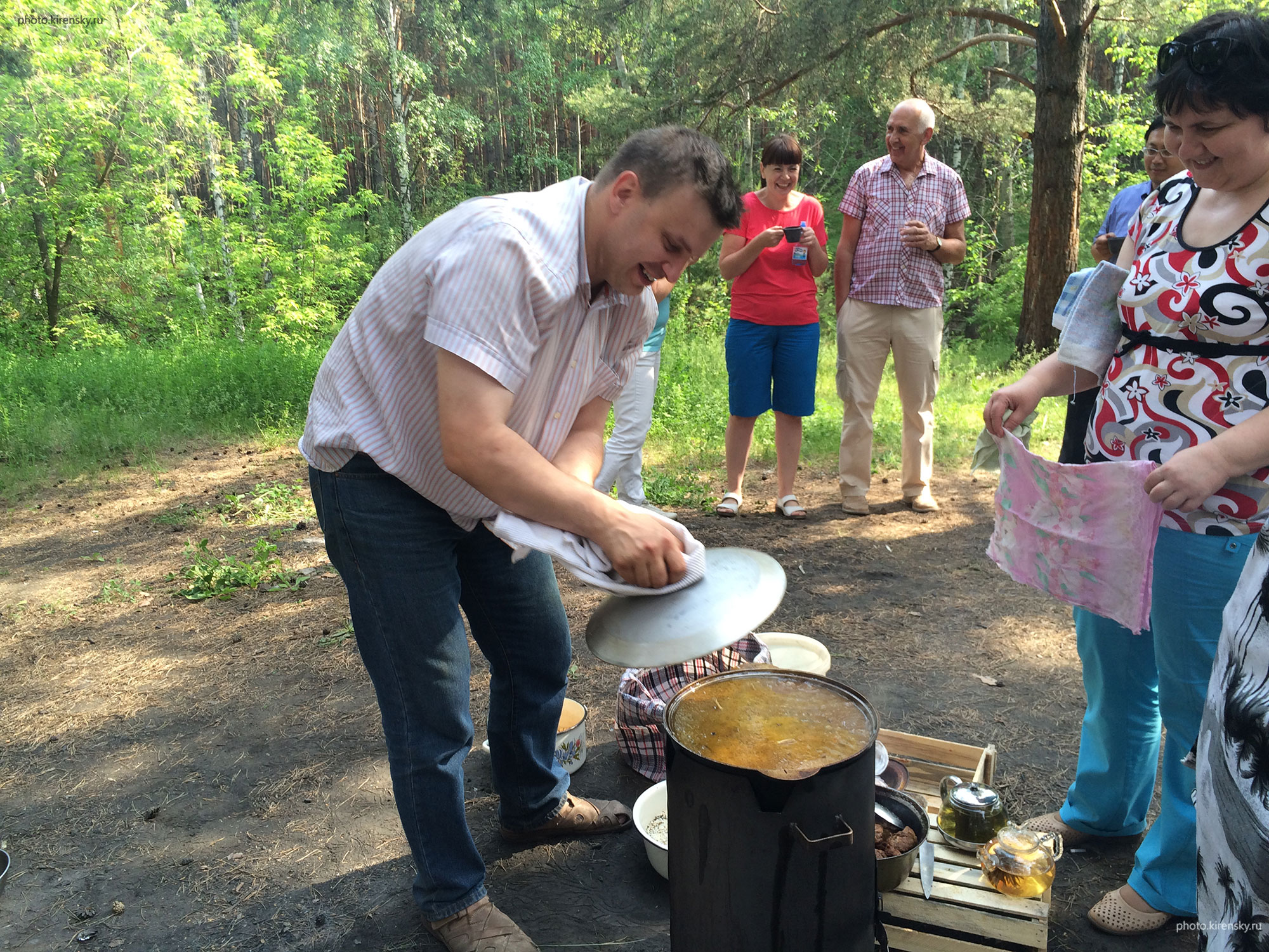 Июнь 2014 года. На снимке - пикник сотрудников лаборатории физики магнитных явлений (ФМЯ) Института физики им. Л.В. Киренского Сибирского отделения Российской академии наук с гостями из Тайваня. У костра старший научный сотрудник лаборатории Томилин Феликс Николаевич, на заднем плане - заведующий лабораторией Овчинников Сергей Геннадьевич и старший научный сотрудник ФМЯ Иванова Оксана Станиславовна.