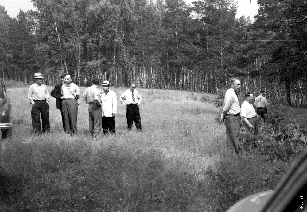 Комиссия по развитию Института физики СО АН СССР, возглавляемая М.А. Лаврентьевым (справа, высокий), председателем Сибирского отделения Академии наук СССР знакомится с земельным участком, отведенным на Афонтовой горе для строительства Красноярского Академгородка, 1957 г.