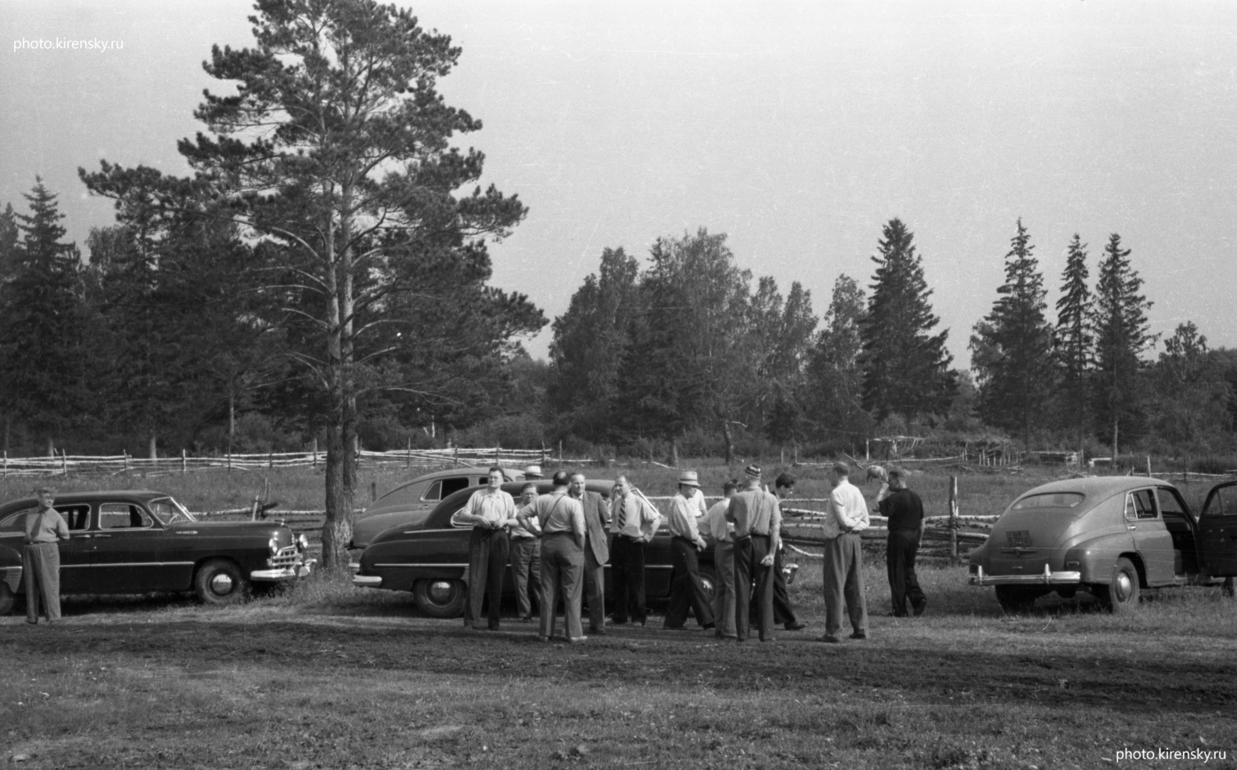 Комиссия по развитию Института физики СО АН СССР во главе с председателем Президиума Сибирского отделения АН СССР академиком М.А. Лаврентьевым, знакомится с площадкой будущего Академгородка Красноярска на Афонтовой горе, 1957 г.