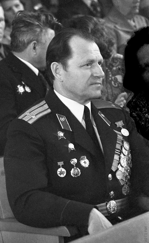 Пугачев Владимир Николаевич, начальник отдела гражданской обороны в Институте физики им. Л.В. Киренского Сибирского отделения Академии наук СССР (ИФ СО АН СССР), участник Великой Отечественной войны (1941-1945 гг.), на торжественном заседании, посвященном Дню Победы в конференц-зале института в 1985 году. Красноярск.