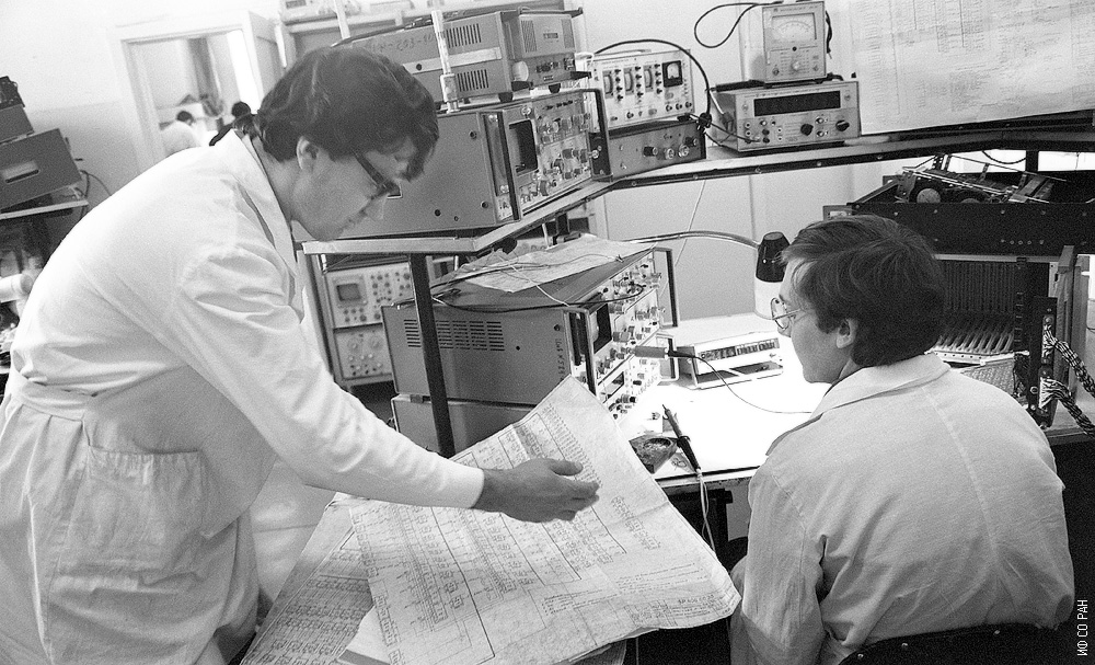 Раков Василий Дмитриевич (слева) и Ширман Александр Давидович, инженеры группы электроники конструкторского бюро Института физики им. Л.В. Киренского Сибирского отделения Академии наук СССР (ИФ СО АН СССР). Фото 1984 года. Красноярск.