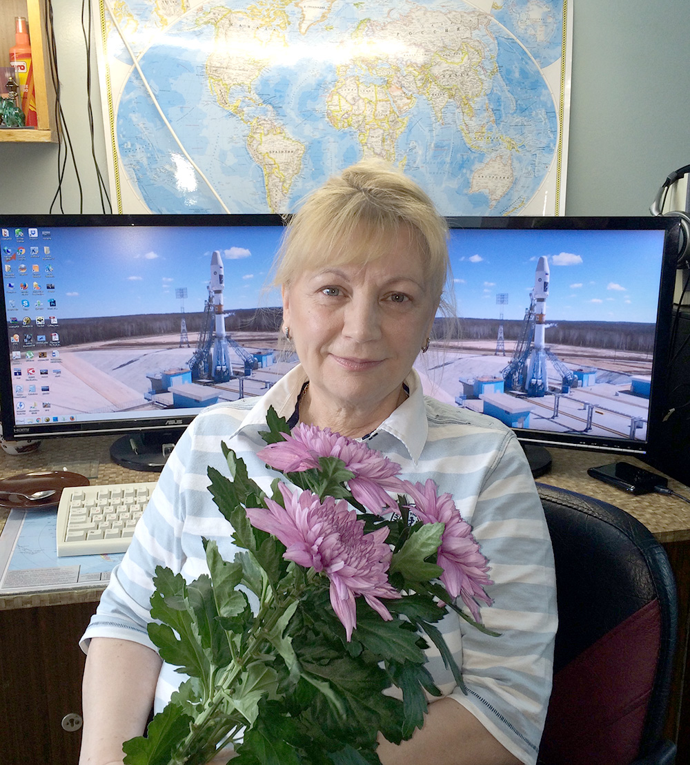 Руденко Людмила Михайловна. 2015 г. На мониторах - идет прямая трансляция первого запуска с космодрома "Восточный".