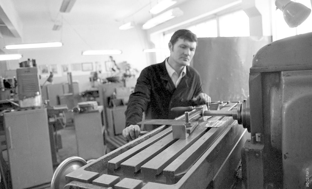 Шидловский Виктор Федорович, фрезеровщик в экспериментальных механических мастерских Института физики им. Л.В. Киренского Сибирского отделения Академии наук СССР (ИФ СО АН СССР). Снимок 1984 года. Красноярск.