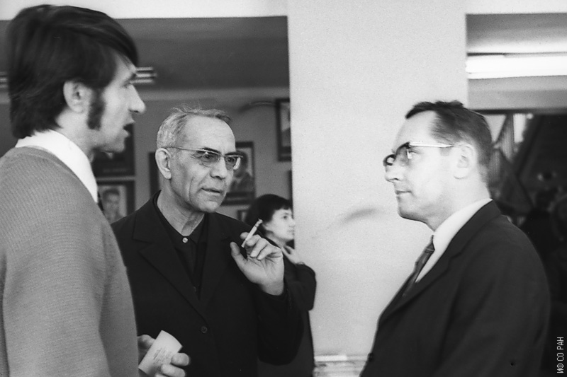 Сотрудники Института физики им. Л.В. Киренского Сибирского отделения Академии наук СССР (СО АН СССР с 1991 года - СО РАН) в Президиуме Сибирского отделения АН СССР на собрании, посвященном 250-летию образования Академии наук СССР. Слева направо: Смокотин Э. М., ученый секретарь, Калинин Ю. Д., заместитель директора по научной работе, Александров К. С., директор института. Фото 1974 года, Новосибирск.