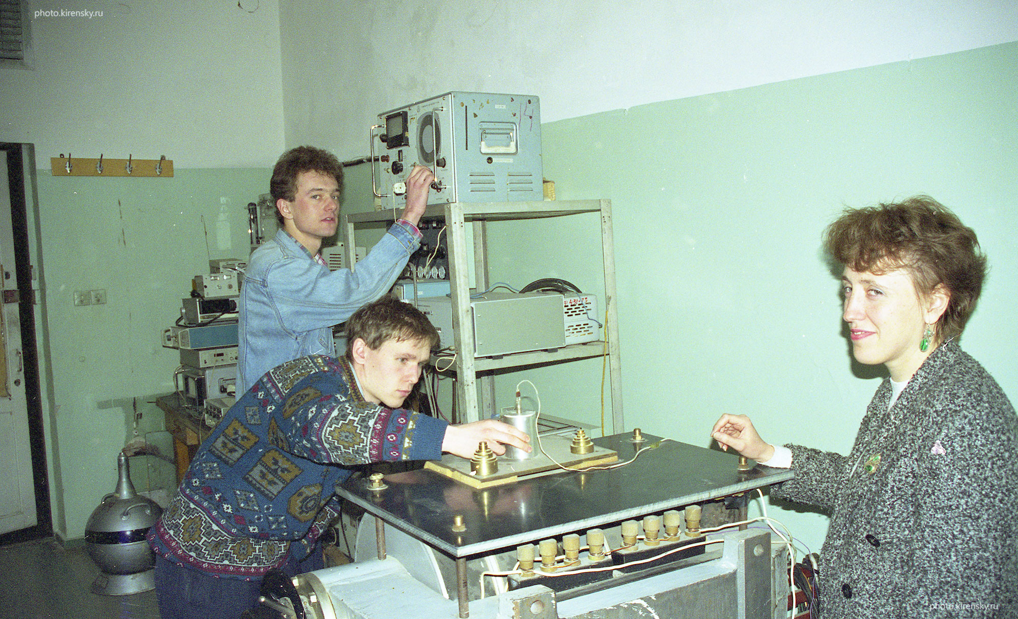 Халяпин Д.Л., Столяр С.В. (в центре) и Денисова Е.А., сотрудники лаборатории физики магнитных плёнок Института физики им. Л.В. Киренского Сибирского отделения Российской академии наук, в лаборатории. Фото 1996 года.