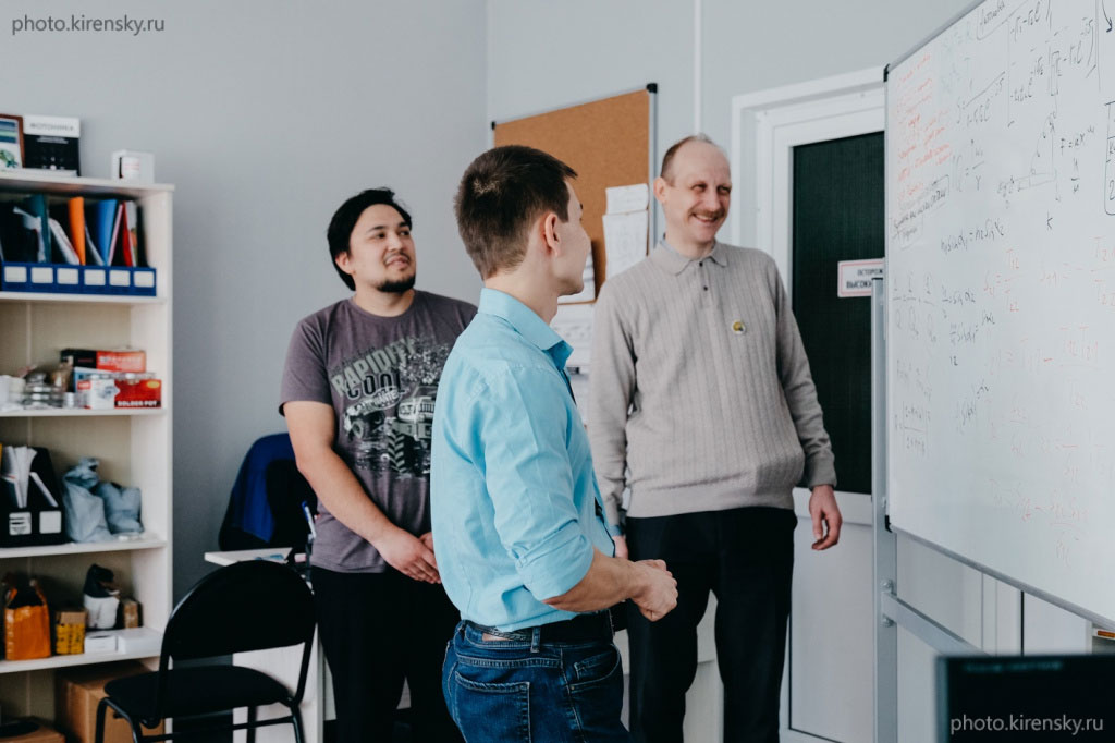 Тимофеев Иван Владимирович, доктор физико-математических наук, заведующий лабораторией фотоники молекулярных систем Института физики им. Л.В. Киренского Сибирского отделения Российской академии наук (ИФ СО РАН) в лаборатории за очередным обсуждением эксперимента с сотрудниками лаборатории. Слева направо: Ким Петр Николаевич – инженер, Тимофеев И.В. На переднем плане – Романенко Гавриил. Фото 2022 года.