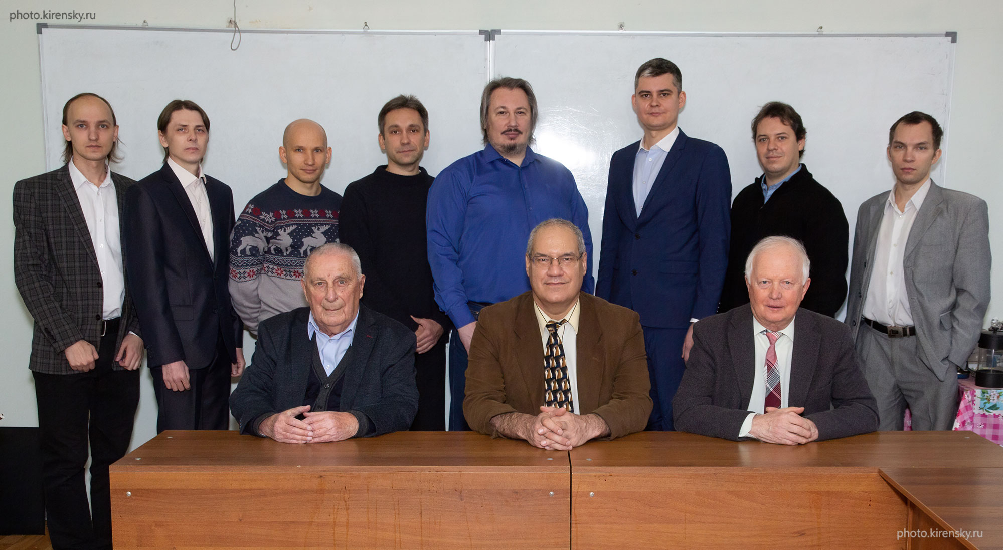 Сотрудники лаборатории теоретической физики Института физики им. Л.В. Киренского Сибирского отделения Российской академии наук сидят, (слева направо): Игнатченко Вальтер Алексеевич, профессор, доктор физико-математических наук, Заслуженный деятель науки Российской Федерации, заведующий теоретическим отделом и заведующий лабораторией с 1963 по 2003 год, Дзебисашвили Дмитрий Михайлович, доктор физико-математических наук, заведующий лабораторией с 2018 года, Вальков Валерий Владимирович, профессор, доктор физико-математических наук, заведующий лабораторией с 2003 по 3018 год. Во втором ряду: Цикалов Денис Сергеевич, кандидат физико-математических наук, Полухин Дмитрий Сергеевич, кандидат физико-математических наук, Аксенов Сергей Владимирович, доктор физико-математических наук, Коровушкин Максим Михайлович, доктор физико-математических наук, Мицкан Виталий Александрович, кандидат физико-математических наук, Злотников Антон Олегович, кандидат физико-математических наук, Шустин Максим Сергеевич, кандидат физико-математических наук, Федосеев Александр Дмитриевич, кандидат физико-математических наук. Фото 2022 года.