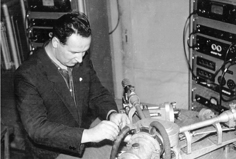 Бондаренко Г.В., сотрудник лаборатории физики магнитных явлений Института физики Сибирского отделения АН СССР, за работой на спектрометре ФРС-2, который позволял проводить измерения интенсивности рентгеновских линий для определения толщины и состава магнитных пленок любых сплавов, фото 1960 года. Красноярск.