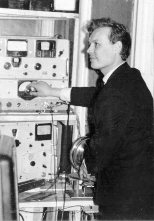 Хрусталёв Борис Петрович, сотрудник лаборатории высокочастотных и импульсных свойств тонких магнитных пленок Института физики Сибирского отделения Академии наук СССР за установкой по исследованию ферромагнитного резонанса в пленках в широком диапазоне частот, фото 1967 года. Красноярск.