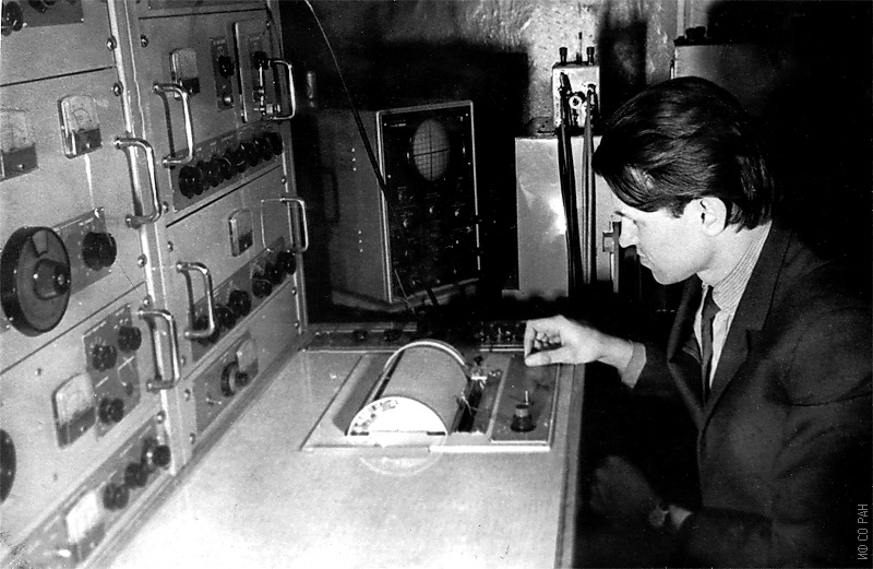 Афанасьев М. Л., сотрудник лаборатории радиоспектроскопии Института физики Сибирского отделения Академии наук СССР (ИФ СО АН СССР), за работой на спектрометре ЯМР с разрешением 3х10-9, фото 1967 года. Красноярск.