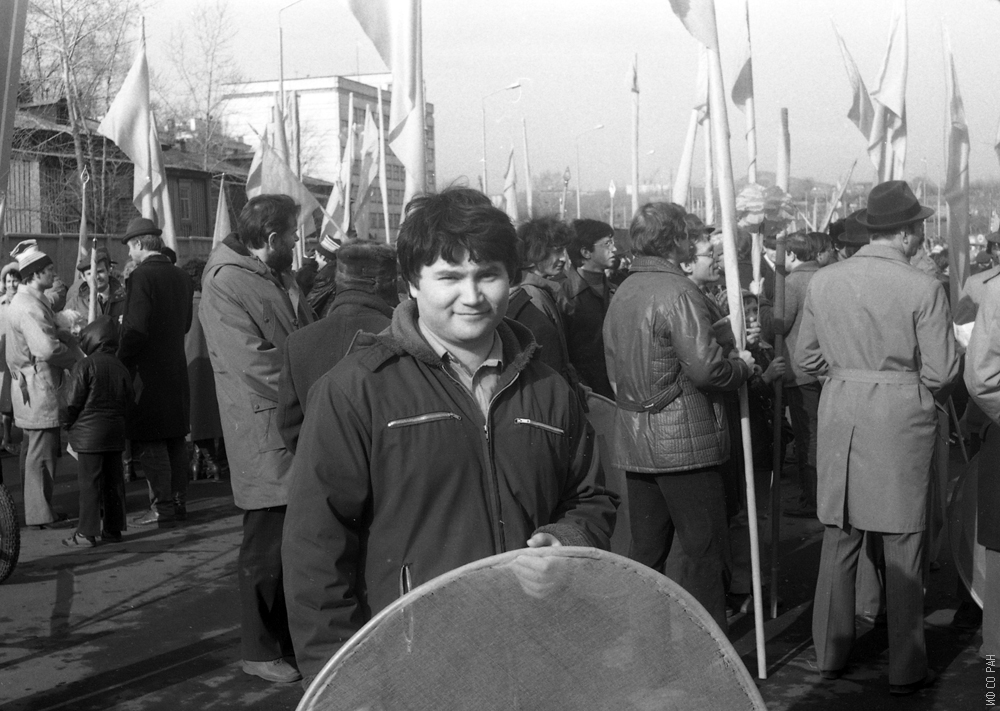 Аврамов Павел Вениаминович, сотрудник Института физики им. Л.В. Киренского Сибирского отделения Академии наук СССР (ИФ СО АН СССР), на первомайской демонстрации 1982 года. Красноярск.