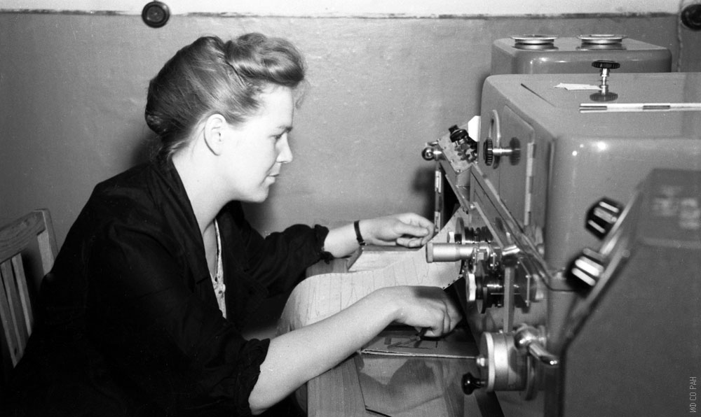 1965 год. Галина Романовна Балуева, сотрудник лаборатории биофизики Института физики Сибирского отделения Академии наук СССР (ИФ СО АН СССР), снимает инфракрасные спектры аминокислот на ИК-спектрометре. Красноярск.