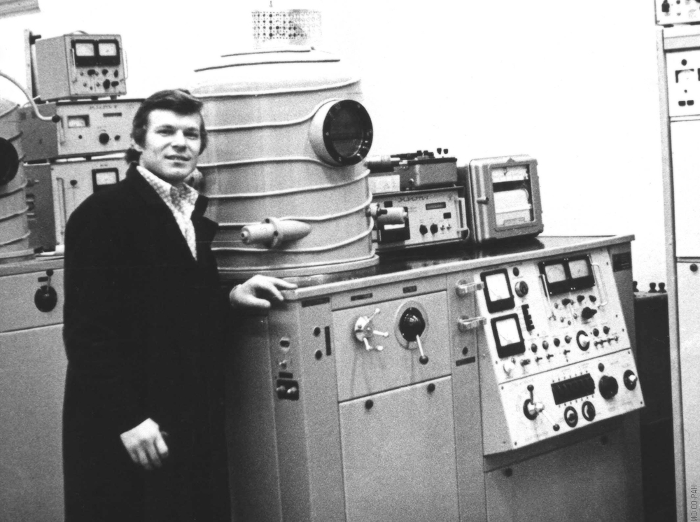 Беляев Б. А. у установки вакуумного напыления тонких магнитных пленок. Лаборатория физики магнитных пленок Института физики им. Л.В. Киренского Сибирского отделения Академии наук СССР (ИФ СО АН СССР). Фото 1980 года.