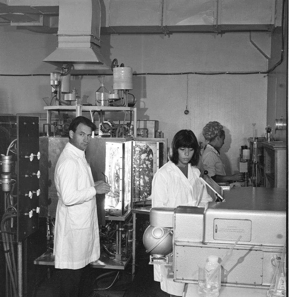 Владимир Николаевич Белянин, руководитель группы фотосинтеза Института физики им. Л.В. Киренского Сибирского отделения Академии наук СССР (ИФ СО АН СССР), у микроводорослевого культиватора для непрерывного культивирования микроводорослей хлореллы, фото 1973 года. Красноярск.