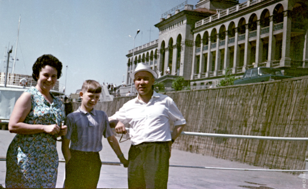 Гомзякова Н. В., старший научный сотрудник лаборатории биофизики, с мужем Николаем Леонидовичем и сыном Анатолием на речном вокзале Красноярска перед отплытием теплохода "В.Чкалов" (рейс Красноярск-Дудинка-Красноярск по Енисею), на котором в июне 1969 года было проведено II Всесоюзное совещание по управляемому биосинтезу и биофизике популяций. Совещание было организовано, подготовлено и проведено отделом биофизики Института физики Сибирского отделения Академии наук СССР (ИФ СО АН СССР).