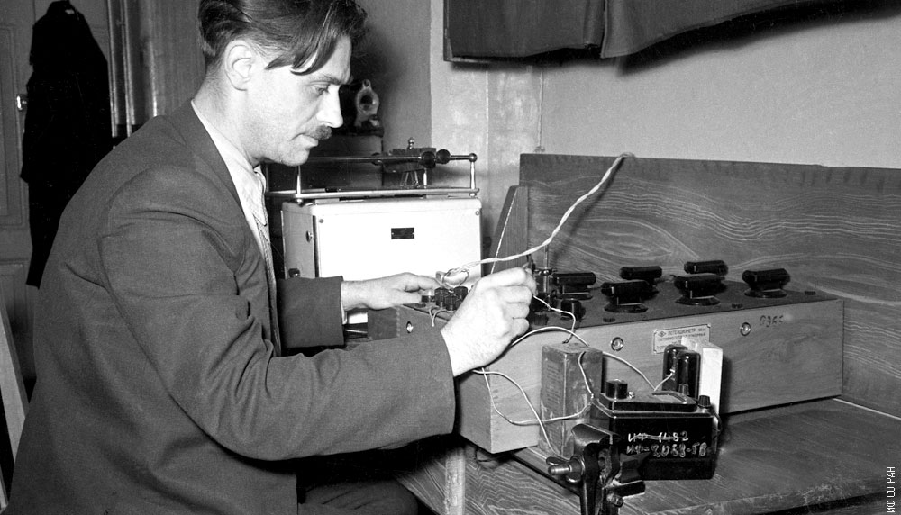 Климов А.П., заведующий химической лабораторией проводит измерения спектров поглощения гетероциклических соединений, фото 1962 года.
