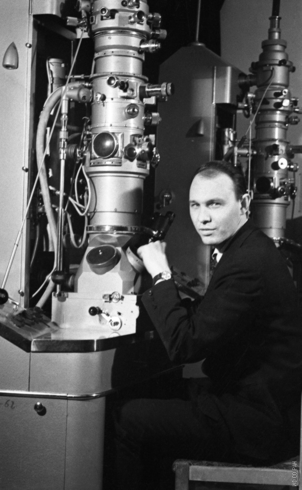 Комалов А.С. старший научный сотрудник лаборатории монокристаллических магнитных пленок Института физики им. Л.В. Киренского Сибирского отделения Академии наук СССР (ИФ СО АН СССР), за работой на электронном микроскопе, фото 1973 года. Красноярск.