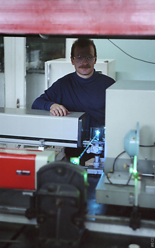 Крылов Александр Сергеевич, старший научный сотрудник лаборатории молекулярной спектроскопии Института физики им. Л.В. Киренского Сибирского отделения Российской академии наук (ИФ СО РАН), на рабочем месте, за установкой Bruker RFS-100/S для температурных измерений спектров комбинационного рассеяния (КР). Снимок 2004 года. Красноярск.