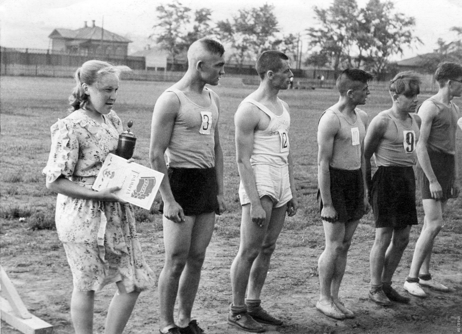 На Красноярском стадионе «Динамо». Третий слева Родичев Александр Михайлович (третий слева), студент пятого курса физико-математического факультета Красноярского государственного педагогического института. Снимок 1953 года. Красноярск.