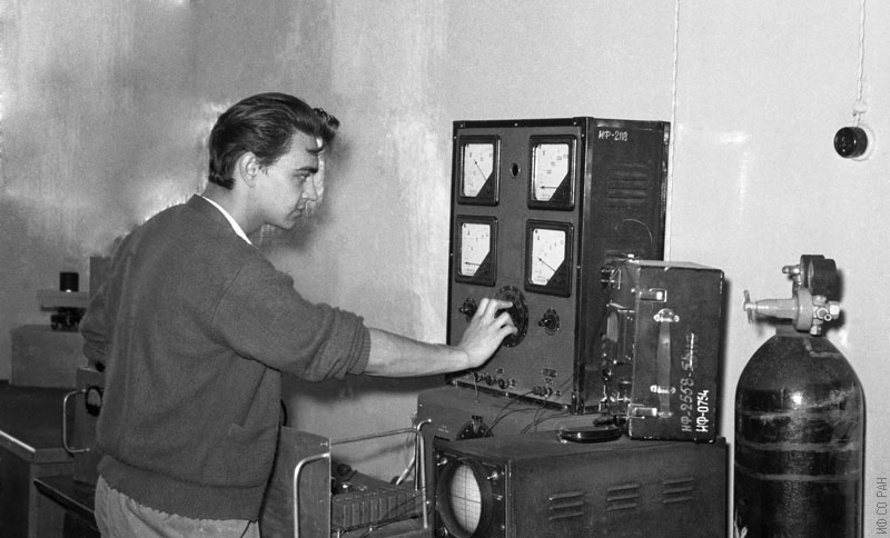 1965 год.Тропин Юрий Дмитриевич, старший научный сотрудник лаборатории магнетизма горных пород и геофизики Института физики Сибирского отделения Академии наук СССР. Занимался исследованием закономерностей, связанных с вязким намагничиванием горных пород. В этом году он защитил диссертацию на соискание ученой степени кандидата физико-математических наук. Красноярск.