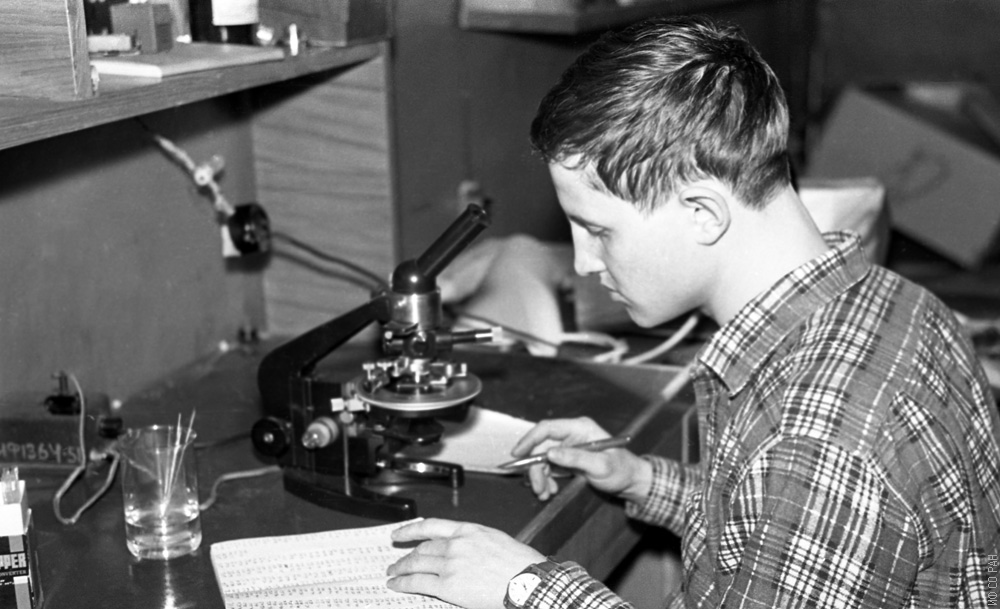 Вахрамеев А.М. сотрудник Института физики Сибирского отделения Академии наук СССР (ИФ СО АН СССР), за работой на электронном микроскопе - готовит кристаллы к исследованиям. Красноярск. Фото 1967 года.