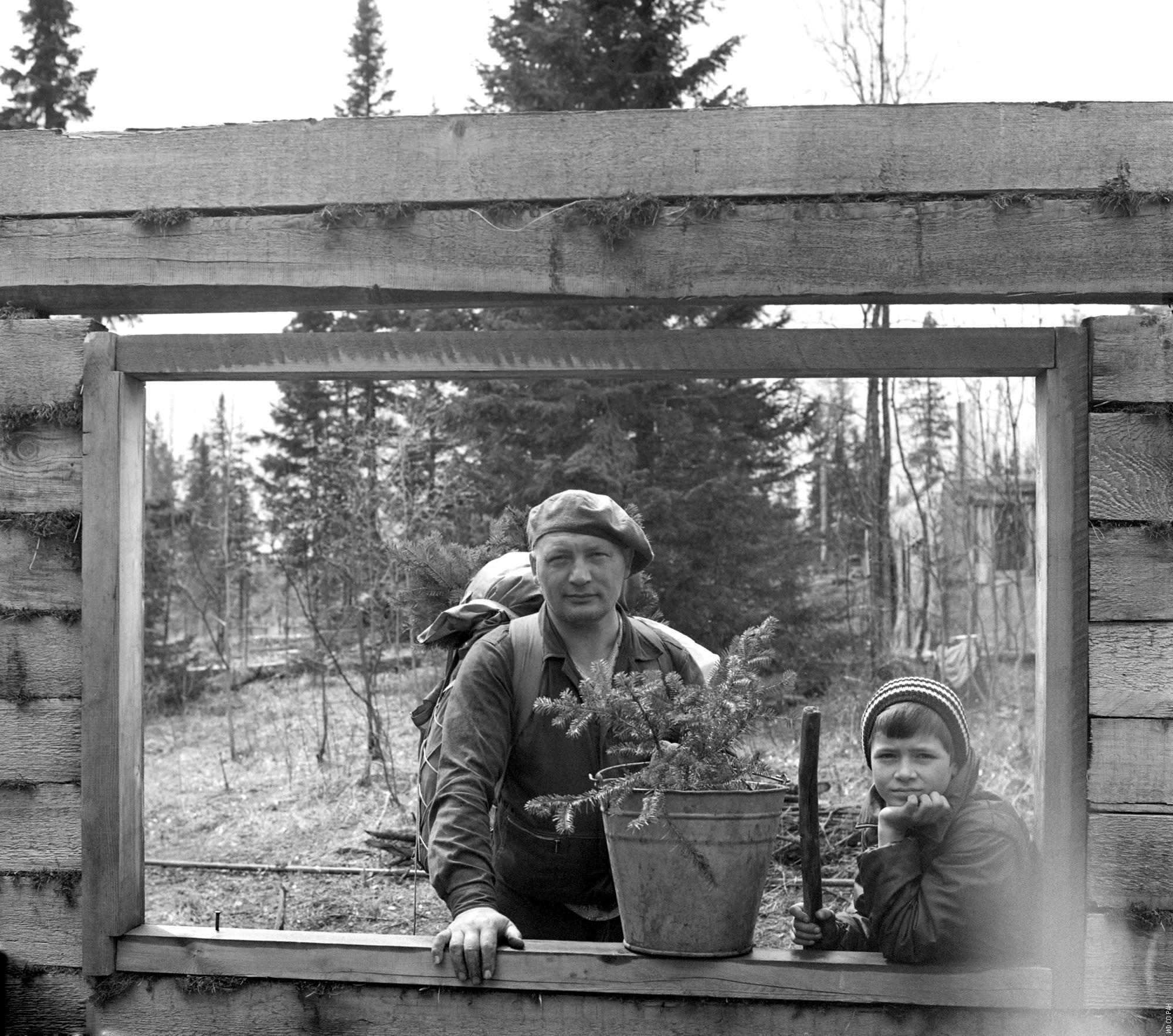 Яницкий Владимир Константинович, инженер в лаборатории магнитных материалов Института физики им. Л.В. Киренского Сибирского отделения Академии наук СССР (ИФ СО АН СССР), с сыном на дачном участке садового общества «Физик» в 1983 году в своем строящемся доме.