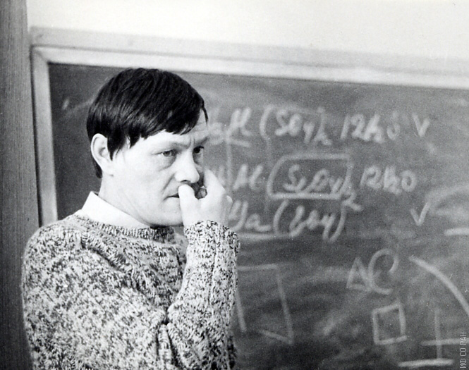 На семинаре лаборатории кристаллофизики Института физики им. Л.В. Киренского Сибирского отделения Академии наук СССР (ИФ СО АН СССР). Выступает старший научный сотрудник Зиненко В.И., фото 1975 года. Красноярск.