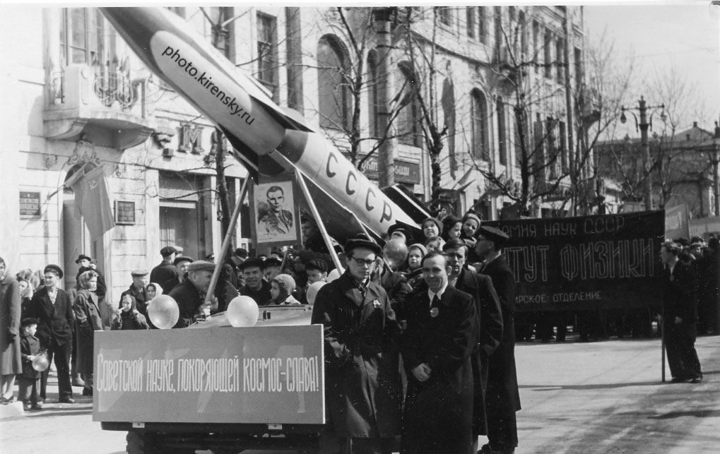 1 мая 1961 года. На первомайской демонстрации трудящихся города Красноярска. Колонна Института физики Сибирского отделения Академии наук СССР (ИФ СО АН СССР). Слева В.В. Спиров.