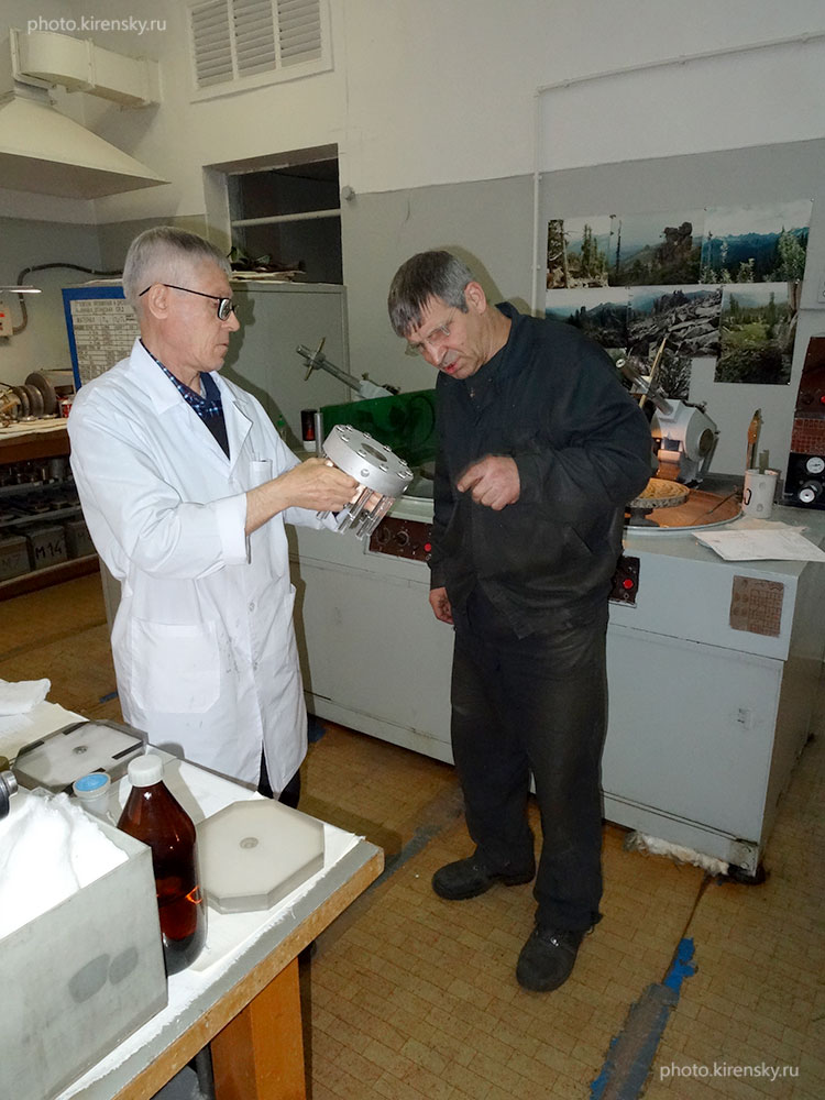 2019 год. Свентитский Владимир Михайлович, сотрудник Института физики им. Л.В. Киренского Сибирского отделения Российской академии наук, занят полировкой оптических стекол, предназначенных для использования в экспериментальной лазерной установке лаборатории Научного приборостроения. Справа фрезеровщик экспериментальных механических мастерских Турко Игорь Маратович. Красноярск.
