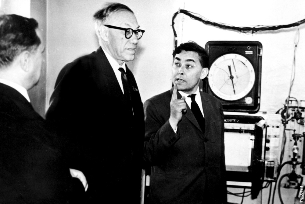 Терсков И .А., заведующий отделом биофизикии Института физики Сибирского отделения Академии наук СССР (ИФ СО АН СССР) (справа), в одной из лабораторий отдела биофизики с председателем Президиума СО АН СССР Лаврентьевым М.А. (в центре) во время его посещения Института физики в 1964 году. Красноярск.