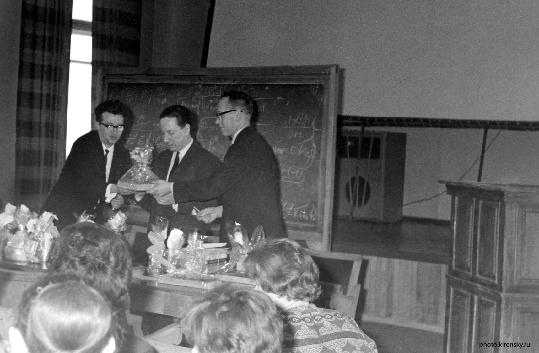 8 марта 1973 года. Международный женский день 8 марта. В актовом зале Института физики им. Л.В. Киренского Сибирского отделения Академии наук СССР (ИФ СО АН СССР) проходило торжественное заседание, посвященное празднику. Подарки дамам вручают (слева направо): Хлебопрос Р.Г., председатель профсоюзного комитета института, Лундин А.Г., и Александров К.С., заместители директора по научной работе. Красноярск.