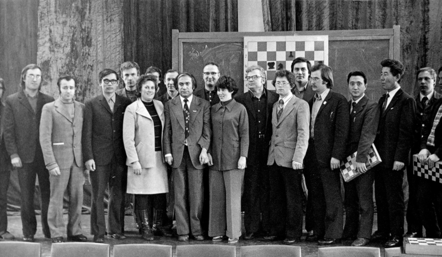 Сотрудники институтов СО АН СССР, участники сеанса одновременной игры с М. Талем, проводившегося в Институте физики в 1975 году.