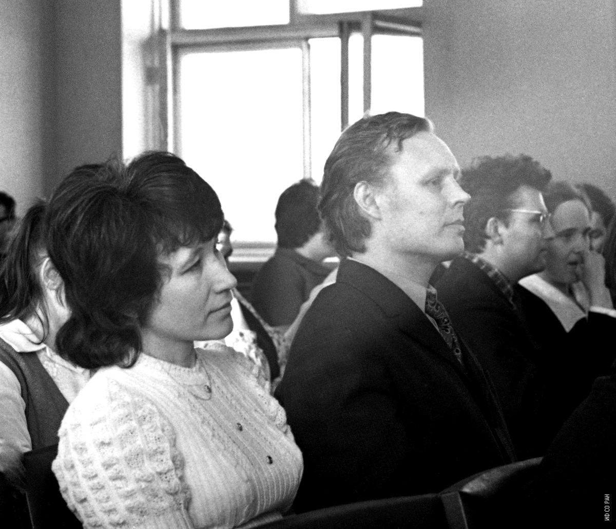 Хрусталева Л. М., Хрусталев Б. П., Федоров В. П., Захарова В.А. (слева направо) в конференц-зале Института физики Сибирского отделения Академии наук СССР (ИФ СО АН СССР) на одном из обще институтских физических семинаров. Фото 1976 года. Красноярск.
