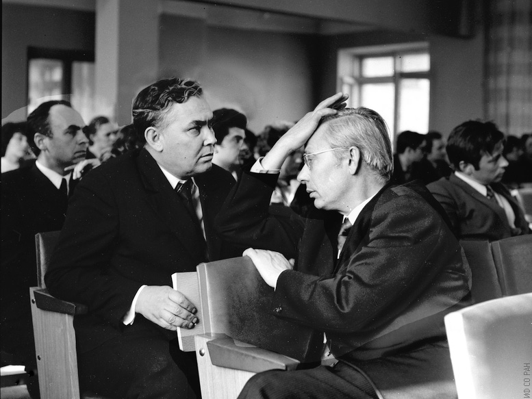 В конференц-зале Института физики им. Л.В. Киренского Сибирского отделения Академии наук СССР (на переднем плане слева направо): Лисовский Г.М., Терсков И.А., Сидько Ф.Я., фото 1974 года. Красноярск.