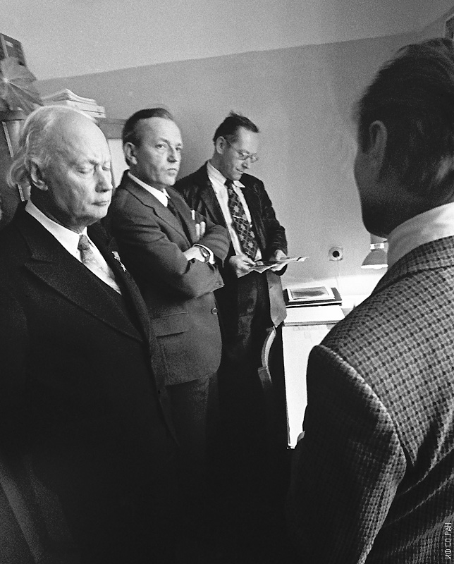 Участники выездной сессии Научного совета по фотосинтезу при Президиуме Академии наук СССР (АН СССР), слева направо: академик Боресков Г.К. - директор Института катализа СО АН СССР, Коптюг В.А. - председатель Президиума СО АН СССР и Александров К.С., заведующий лабораторией кристаллофизики Института физики им. Л.В. Киренского Сибирского отделения Академии наук СССР, в лаборатории кристаллофизики. Пояснения дает Анистратов А. Т., Красноярск, 1980 год.