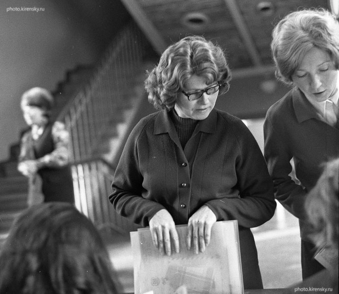 Зайцева Мария Пантелеймоновна (слева), старший научный сотрудник лаборатории кристаллофизики Института физики им. Л.В. Киренского Сибирского отделения Академии наук СССР (ИФ СО АН СССР), на выставке в холле института в 1970 году.
