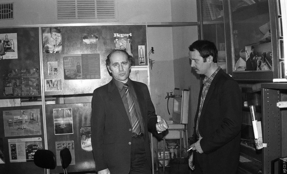 Зеер Э. П. (слева), заведующий лабораторией и Лисин В. В., веущий электроник лаборатории радиоспектроскопического структурного анализа Института физики им. Л.В. Киренского Сибирского отделения Академии наук СССР (ИФ СО АН СССР). Снимок 1988 года, Красноярск
