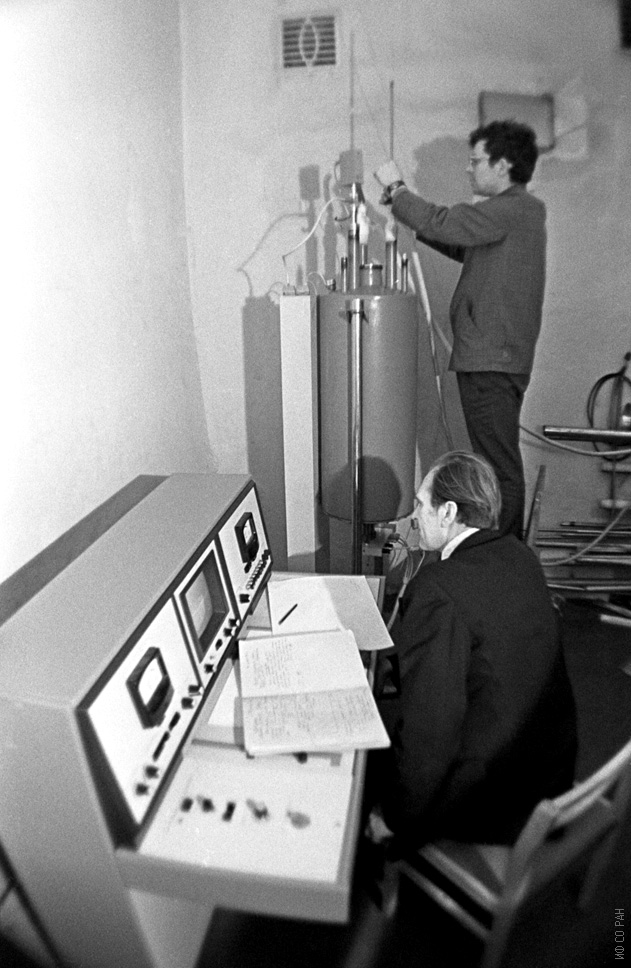 Зеер Эвальд Петрович (сидит), Лыбзиков Геннадий Федотович ведут исследования на ЯМР спектрометре 213М со сверхпроводящим соленоидом, разработанном в лаборатории радиоспектроскопического анализа и изготовленном в экспериментальных механических мастерских института , фото 1982 г.