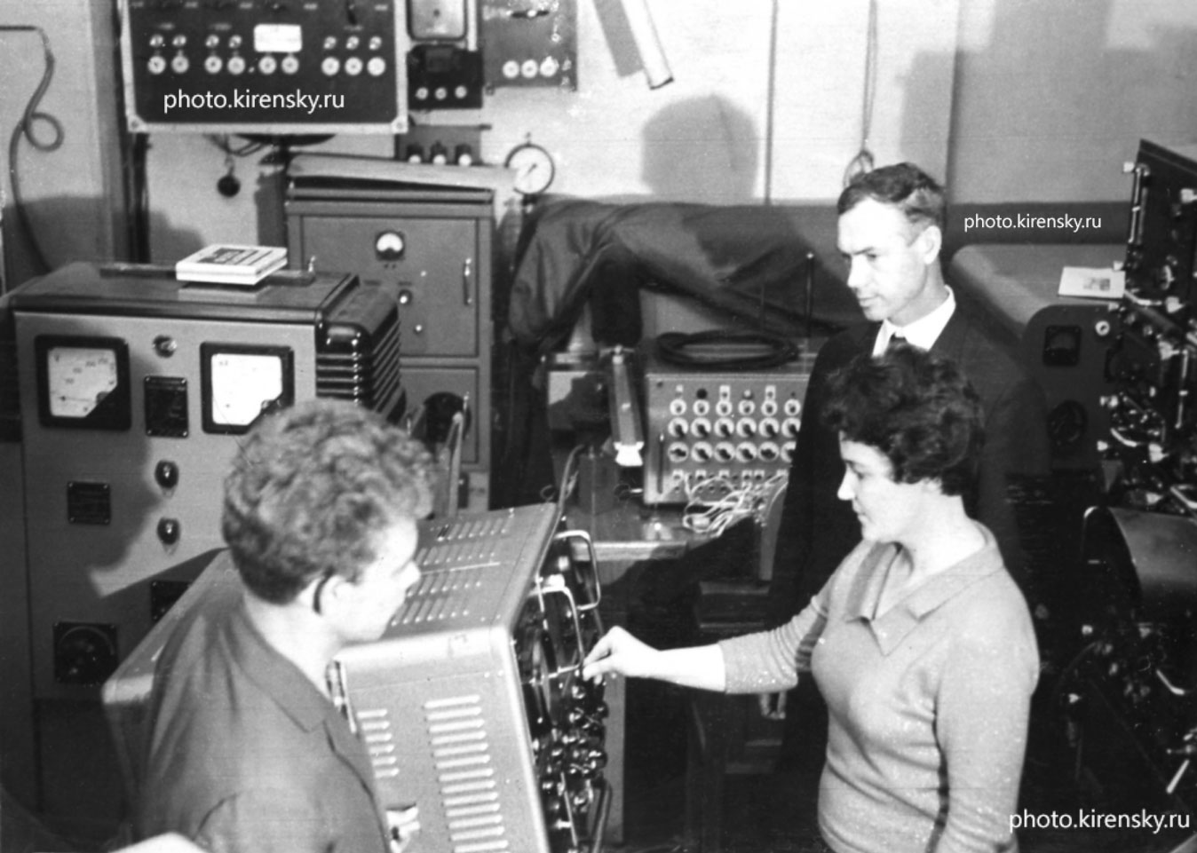 1963 год. На снимке: Золотухин Г.Е. (справа), Зыкова Т.Ф., сотрудники лаборатории эмиссионной спектроскопии Института физики Сибирского отделения Академии наук СССР (ИФ СО АН СССР) (СО АН СССР с 1991 года СО РАН), у установки, позволявшей исследовать явление переноса ионов, возбуждаемых высокочастотным полем. В то время делалась попытка использовать это явление в практике спектрального анализа весьма чистых соединений полупроводниковых веществ, металлов платиновой группы и др. Красноярск.