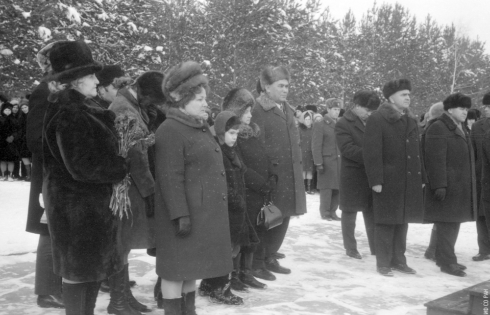 4 ноября 1974 года состоялось открытие памятника на могиле академика Л.В. Киренского в Академгородке Красноярска на территории Института физики Сибирского отделения Академии наук СССР. Институт был организован и открыт в 1956 году. На переднем плане, слева направо: Гительзон, Н.К., Силкова Н.П., внук Юрий, супруга Киренская З.Я. и директор Института физики Терсков И.А.