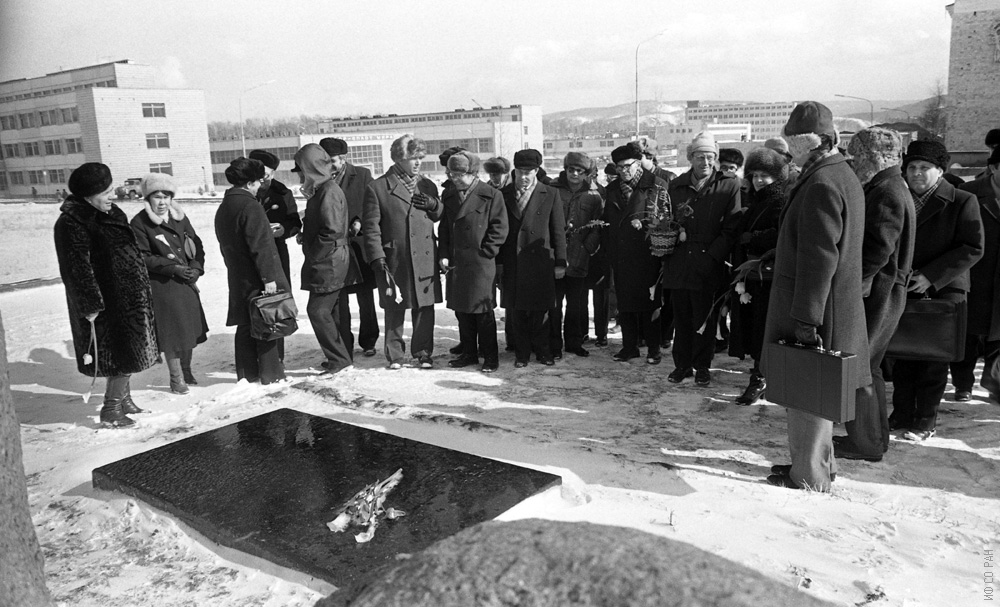 Апрель 1984 года. После традиционных научных чтений памяти академика Киренского Л.В., организатора и первого директора Института физики Сибирского отделения Академии наук СССР. Участники чтений возлагают цветы к памятнику Леонида Васильевича в Академгородке Красноярска , где он похоронен около организованного им института. Слева направо: Балуева Г.Р., Жеребцова Л. И, ?, Бондаренко Г.В., Звегинцев А.Г., Смокотин Э.М., ?, Трубачев И.Н., Петраковский Г.А., Печуркин Н.С., Коршунов А.В., Александров К.С., Захаров Ю.В.