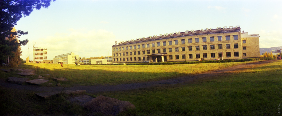 Здание Института физики. Слева технологический корпус и дальше строительство 12-ти этажного здания Президиума Красноярского научного центра, фото 1980 г.