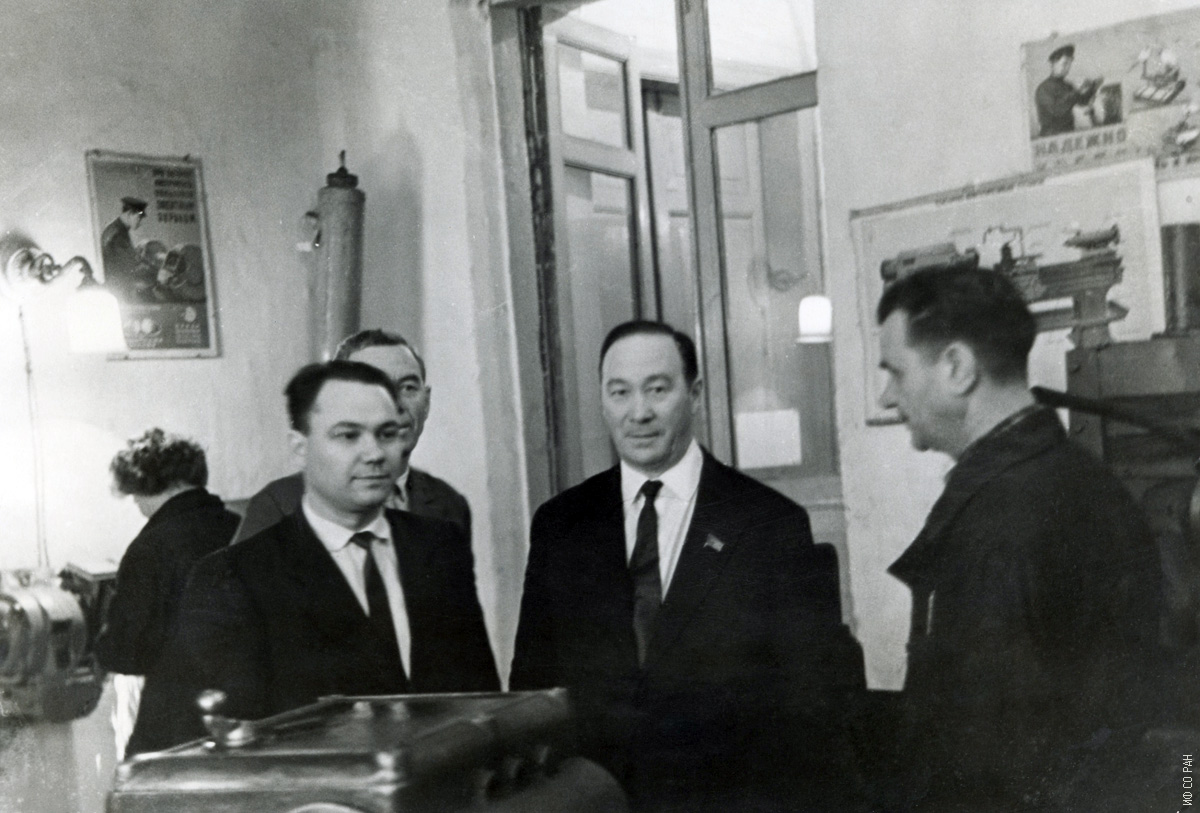 В 1964 год. Институт физики Сибирского отделения Академии наук СССР (ИФ СО АН СССР) посетил директор Института неорганической химии СО АН СССР член-корр. Академии наук А.В. Николаев, директор Института физики твердого тела и полупроводников, член-корр. Академии наук Ржанов А.В. и директор Норильского горно-металлургического комбината Долгих В.И. Снимок сделан в отделе биофизики. Слева направо: Долгих В.И. , Ржанов А.В., Терсков И.А., заместитель директора по научной работе института, Киренский Л.В., директор института, Александров К.С., заместитель директора по научной работе, Гительзон И.И., заведующий лабораторией фотобиологии. Красноярск.