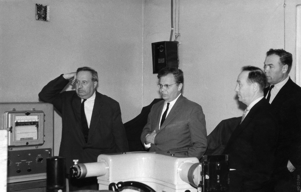 1962 год. Слева направо: В.А. Буравихин (один из первых аспирантов Киренского), Л.В. Киренский (организатор и первый директор Института физики Сибирского отделения Академии наук СССР (ИФ СО АН СССР), М. К. Савченко (один из первых сотрудников института), обсуждают результаты эксперимента по тонким магнитным пленкам. Красноярск.