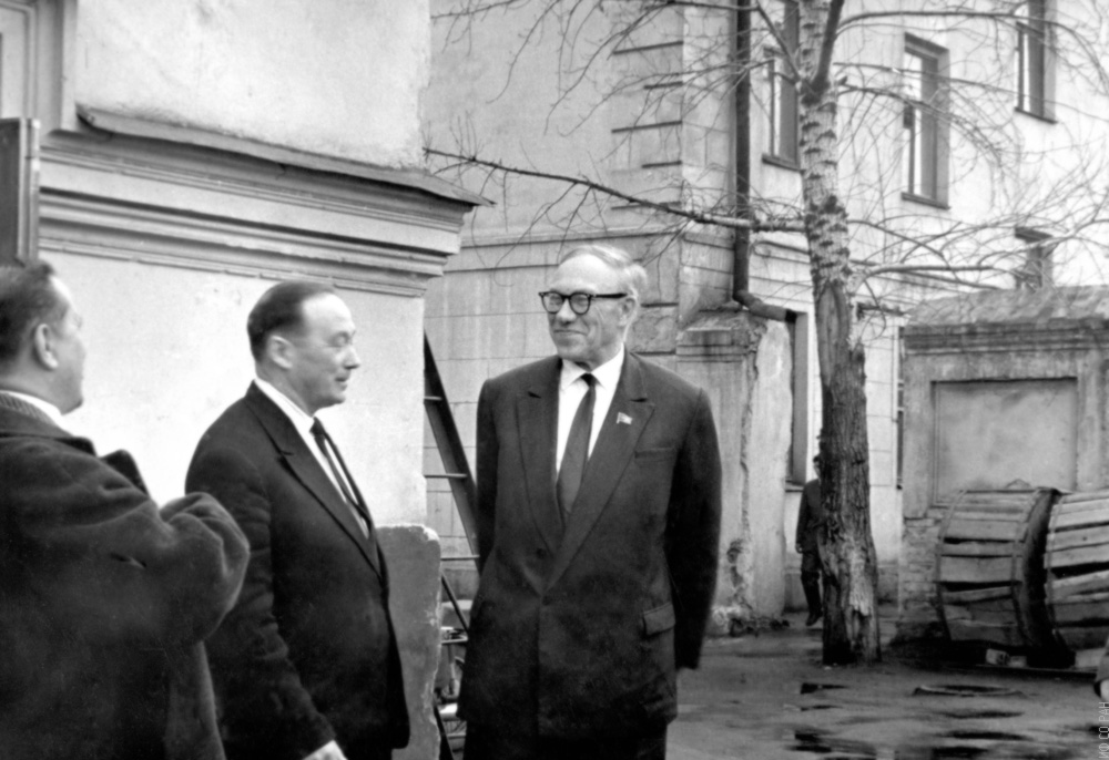 председателем Президиума Сибирского отделения Академии наук СССР академиком М.А. Лаврентьевым (справа), в центре - Л.В. Киренский, директор института. 1964 год. Красноярск.