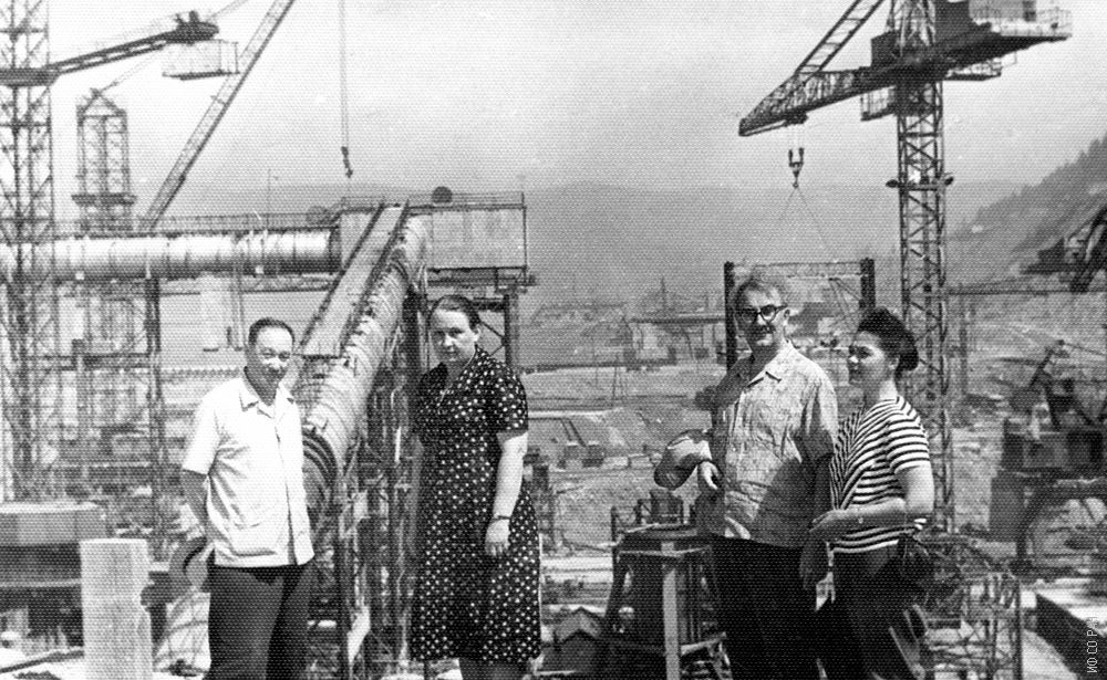В 1966 году Институтом физики Сибирского отделения Академии наук СССР (ИФ СО АН СССР) был организован и проведен первый Всесоюзный симпозиум по сильным магнитным полям. Симпозиум проходил на теплоходе "В. Чкалов", рейс по Енисею Красноярск-Дудинка- Красноярск. На снимке Л.В. Киренский, директор Института физики (слева), с гостями симпозиума на строительстве Красноярской ГЭС.