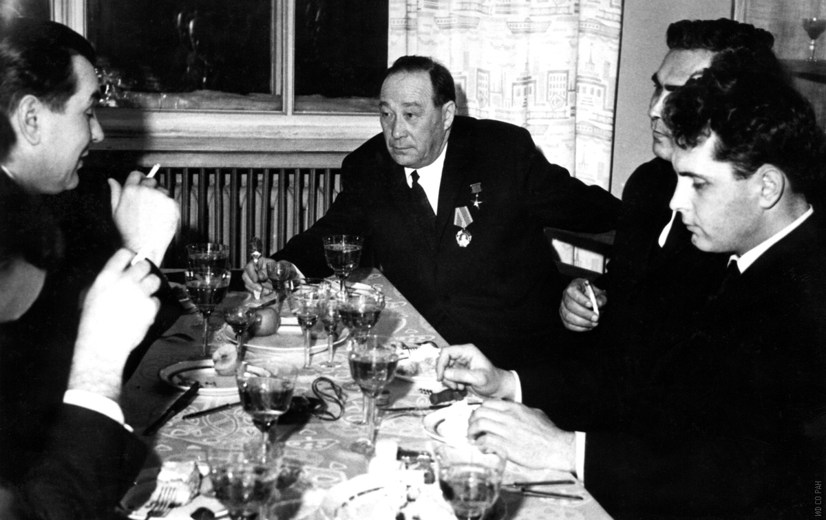 На приеме в честь участников Международной конференции по магнетизму в Москве. В центре американский магнитолог Р.М. Бозорт. Крайний справа академик Л.В. Киренский, организатор и первый директор Института физики Сибирского отделения Академии наук СССР (ИФ СО АН СССР). Снимок 1956 года.
